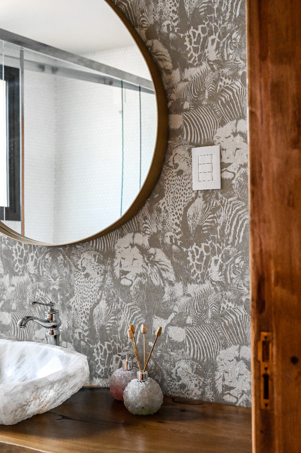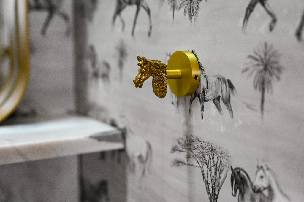 Os papéis com motivos equestres reforçam a ligação da fazenda com o campo e com a cultura dos cavalos, enquanto os padrões naturais trazem leveza e conexão com a paisagem que cerca a casa. Complementando essa composição, texturas sofisticadas — como superfícies que remetem à pele de cobra — acrescentam profundidade e um toque contemporâneo aos ambientes.